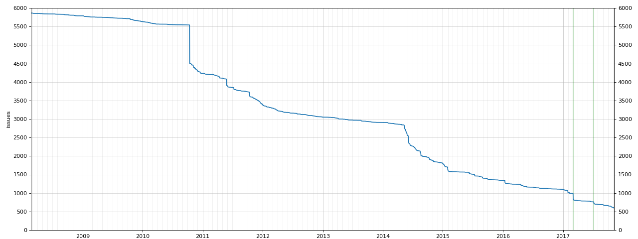 Technical about the graph calculation: The calculation was done with a simple Python script (modx_issues.py). I realize after implementing it that it has a few shortcomings. The script only takes into account the number of total issues, not the time they were opened. This means that there were most likely fewer issues open than reflected in the graph. I am thinking about expanding the current code to take the date the issue was opened into account. This could also populate two other graphs: progression of opened issues and the total number of open issues at any day. I will look at this in a future post.