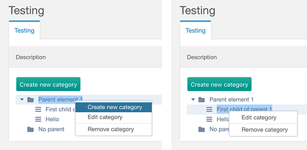 During development this was, we have ignored a few things that might results in problems or bugs. The component should only support two levels of categories, and disable creating categories deeper in the tree. Right now it had support to create child categories of secondary categories. It also allowed dropping a primary category onto a secondary category, which would produce three levels of categories if allowed. It would, in addition, be nice to be able to add a secondary category if we right clicked on a primary category.